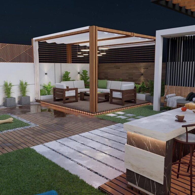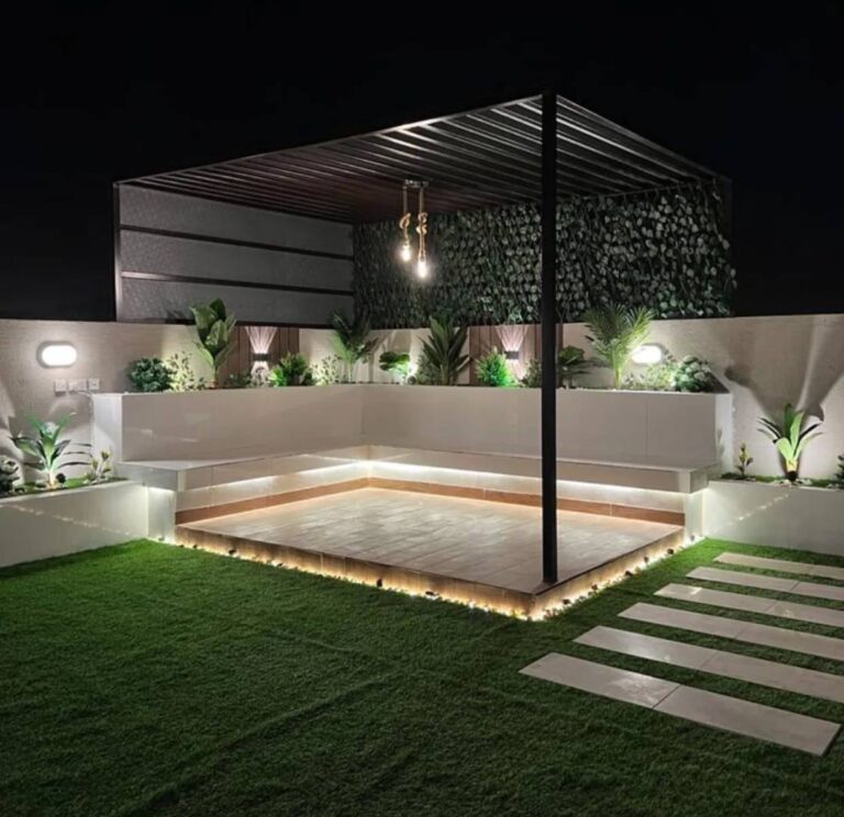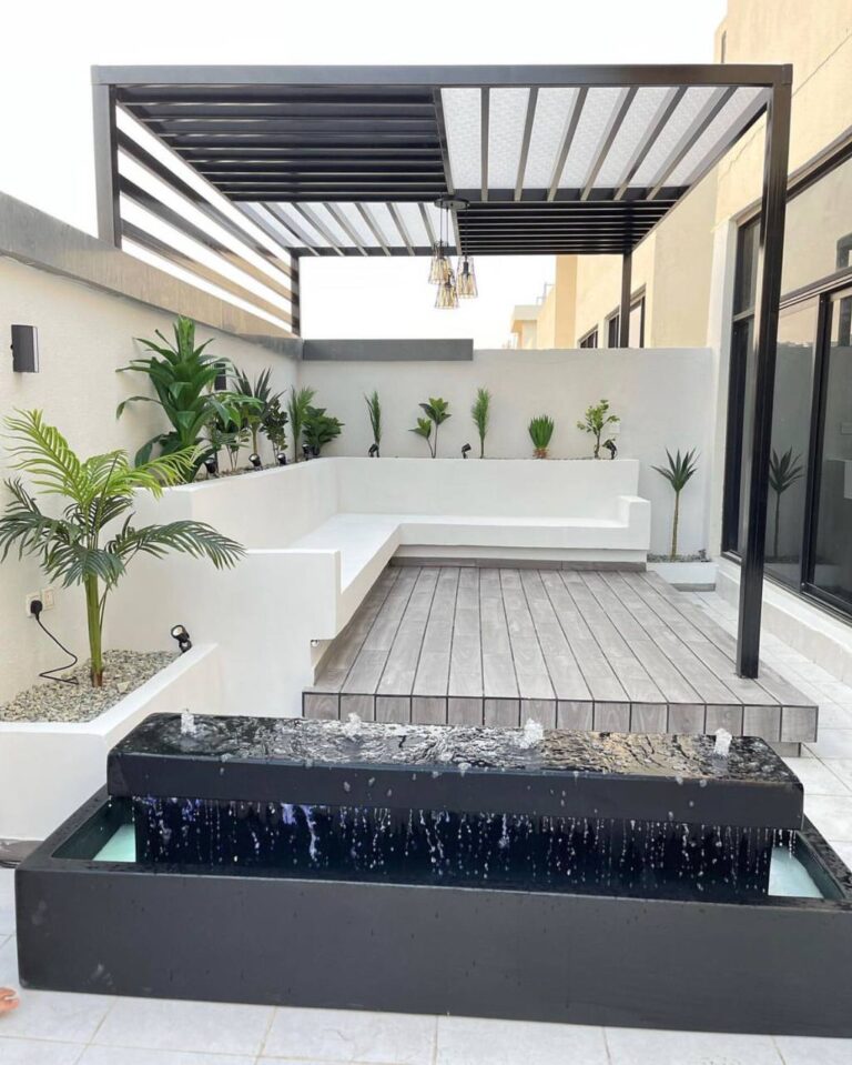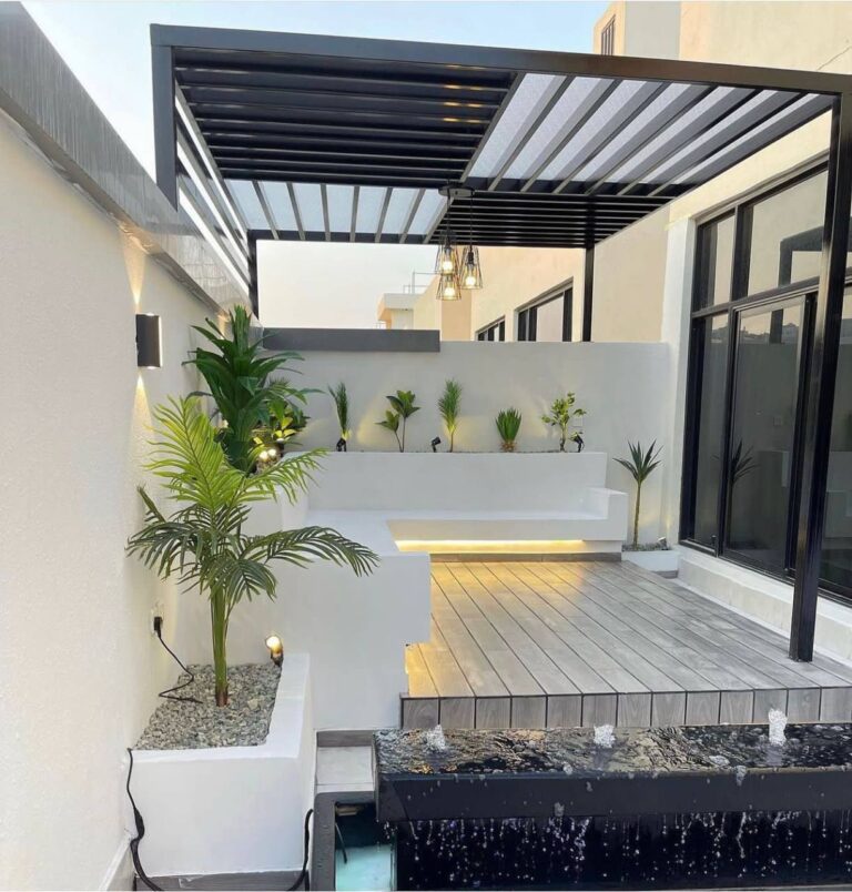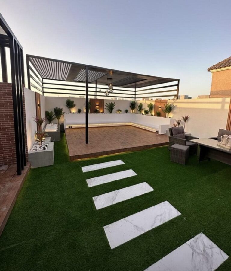 3. جلسات خارجية حديثة: تجمع بين البساطة والأناقة باستخدام مواد عصرية مثل الألمنيوم والخشب والزجاج.